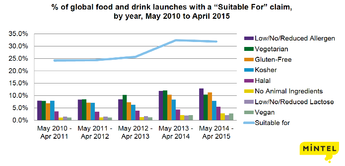 Porcentaje de lanzamientos globales de comida y bebida con el claim “apto para”, por año, desde Mayo de 2010 hasta Abril de 2015. (Fuente: Mintel)